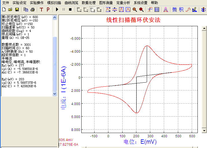 由測量結(jié)果可知,氧化峰電位為Ep2=277mV,峰電流為ip2=5.596591′10-6A;還原峰電位是Ep1=203mV,峰電流是ip1=5.568737′10-6A。氧化峰還原峰電位差為74mV,峰電流的比值為:ip1/ip2=1.005≈1。由此可知,鐵氰化鉀體系(Fe(CN)63-/4-)在中性水溶液中的電化學(xué)反應(yīng)是一個(gè)可逆過程。(注:由于該體系的穩(wěn)定,電化學(xué)工作者常用此體系作為電極探針,用于鑒別電極的優(yōu)劣。)