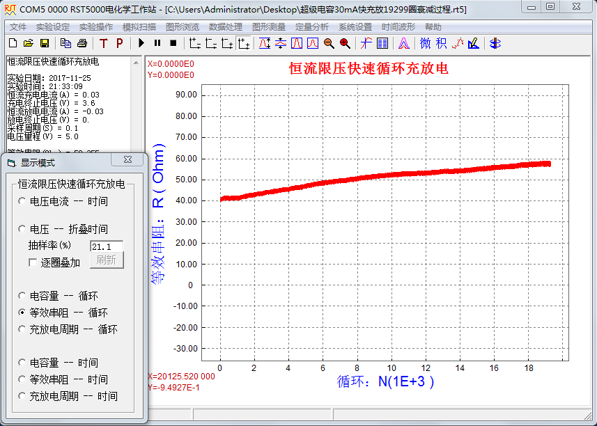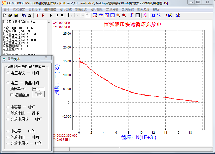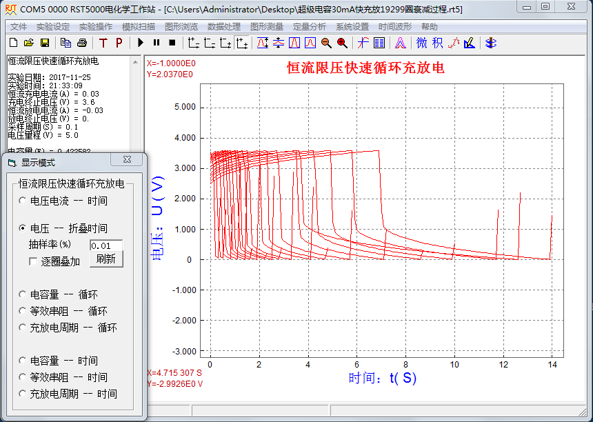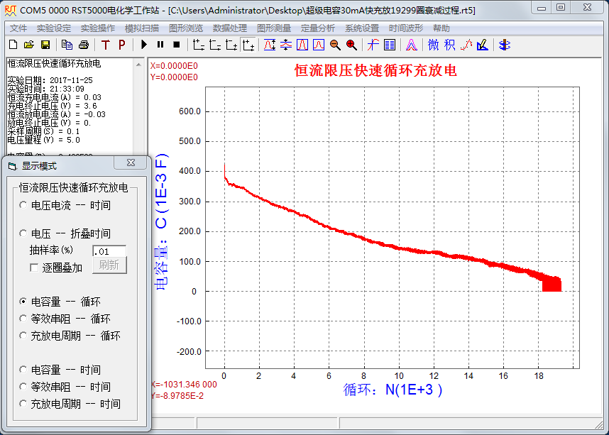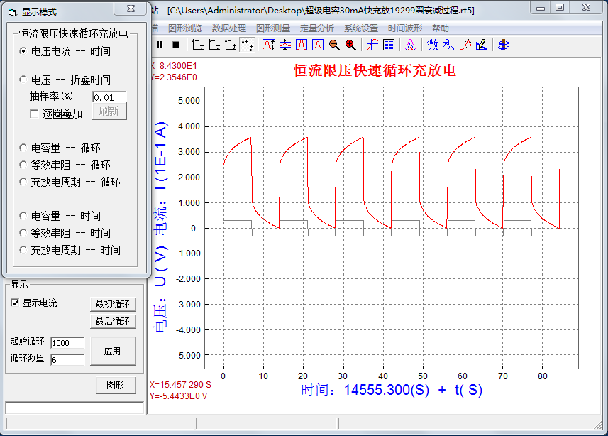 超級電容器的循環(huán)壽命與眾多因素有關,如:電極特性、溶液特性、工作溫度、充放電電流、最高充電電壓、封裝因素、工藝因素等。用RST5000系列電化學工作站中的“恒流限壓快速循環(huán)充放電”方法可對超級電容器進行測量,可獲得電容量、等效串阻、充放電周期等參數(shù)。如對超級電容器進行長時間測量,則可評估超級電容器的循環(huán)壽命。