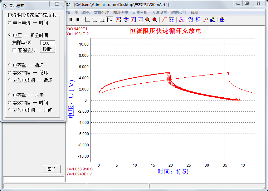 主要參數(shù)有:充電電流、充電限制電壓、放電電流、放電限制電壓、采樣周期、循環(huán)圈數(shù)、電壓量程。