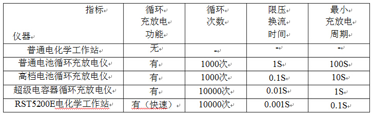 對(duì)超級(jí)電容器實(shí)施快速循環(huán)充放電,需要設(shè)立一個(gè)限壓換流模塊,屬于反饋控制。就是當(dāng)采集單元檢測(cè)到超級(jí)電容器兩端的電壓超越限定值后,立即通知驅(qū)動(dòng)單元改變電流方向。限壓換流的過程必須快速,否則就控制不住了。在 RST5200E電化學(xué)工作站中,限壓換流功能由硬件實(shí)現(xiàn),從而確保該反饋控制過程小于1mS。下表列出了一些電化學(xué)測(cè)試儀器的指標(biāo):