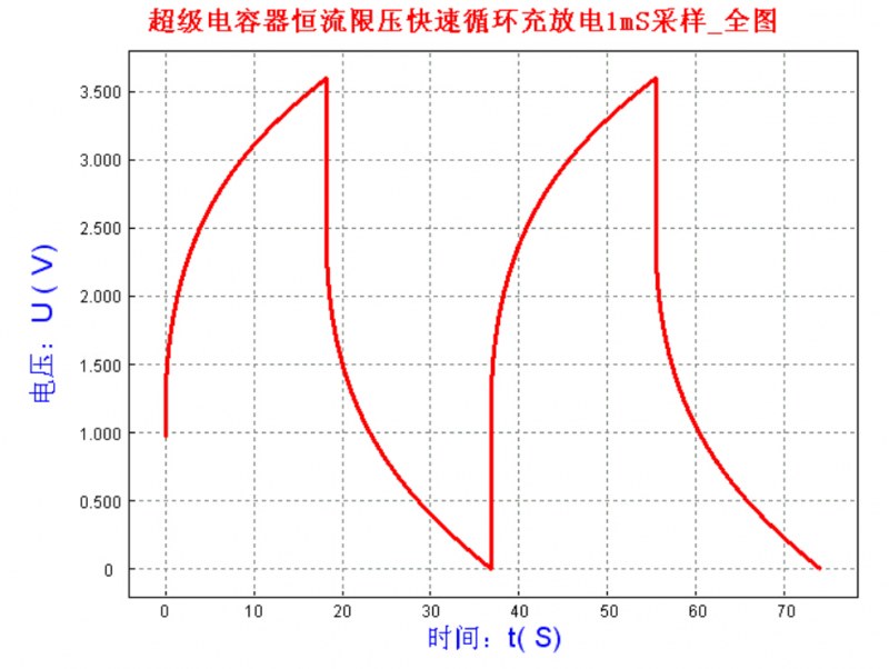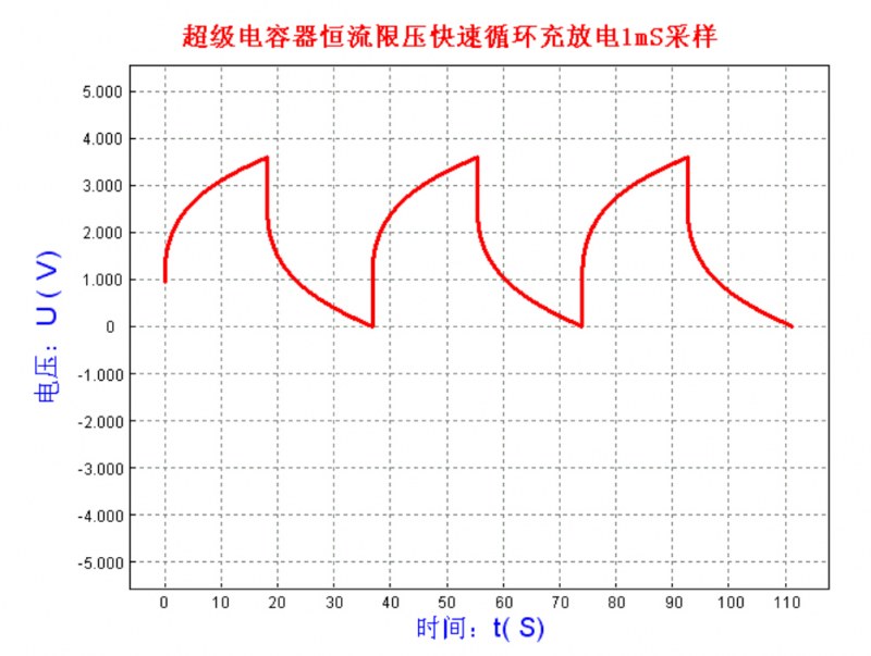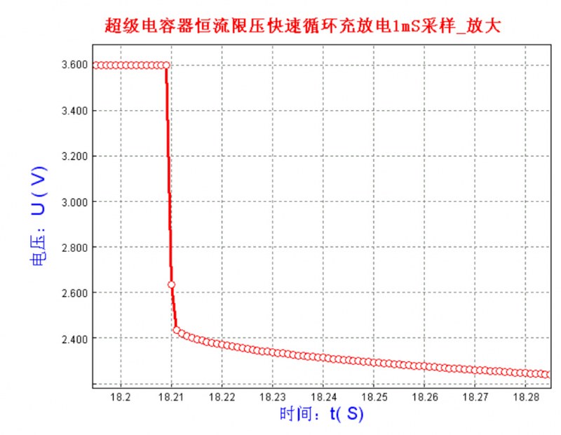 這是一種快速方法,最高采樣率為1000sps。用于研究超級(jí)電容器的高頻充放電特性,如:充放電對(duì)稱性、高頻電容特性、溫升特性、串聯(lián)電阻特性等。